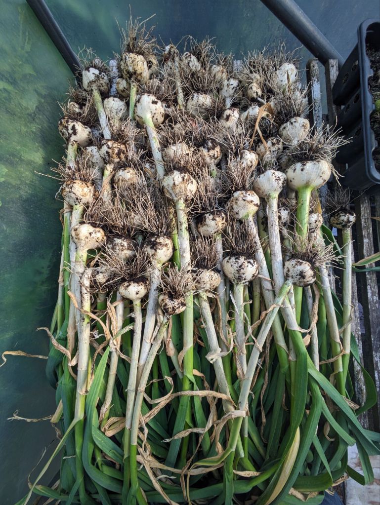 With this in mind, last October, after I’d cut down all the tomato plants in the polytunnel, I planted about 70 garlic cloves which I’d saved from last year’s crop. Then I basically just left them to it. They grew very well in autumn and spring, and this week began to show they were ready to harvest by gradually all falling over. This afternoon I lifted them, and this is the result.