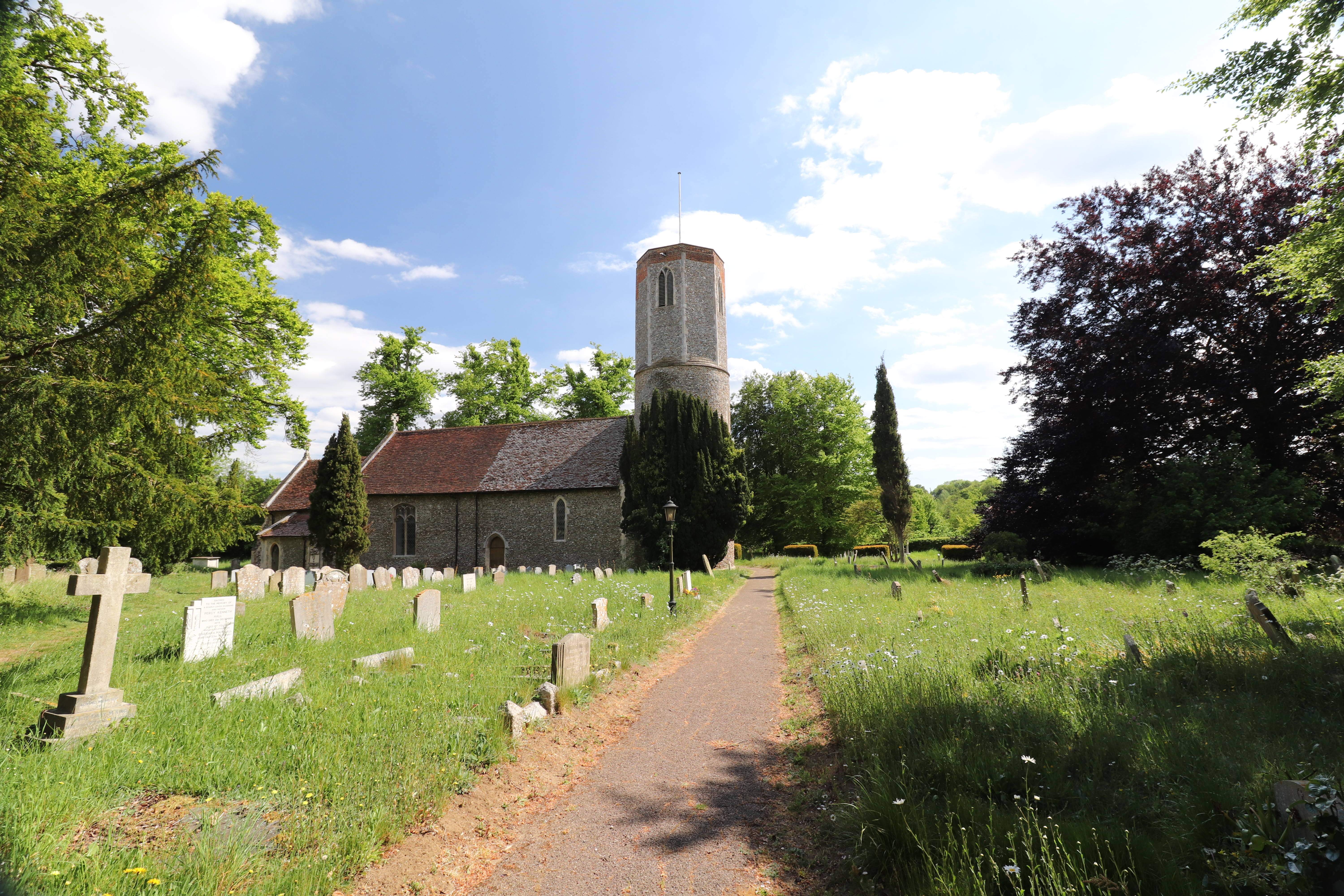 Of particular interest are two pieces of stone from the 12th century and the 15th century font with Tudor roses. The outside of the church is noted for the round tower dating from Norman times and some early masonry work from the 11th century.