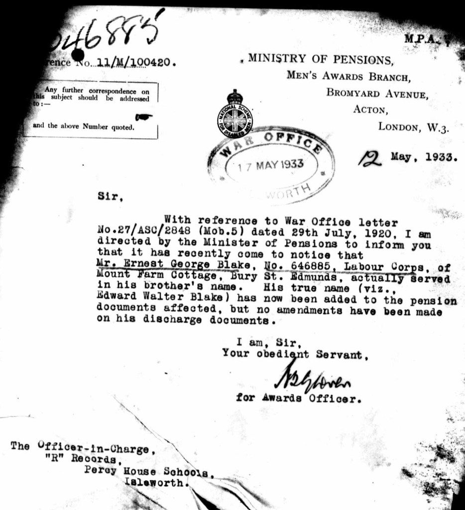 Charles’ cousin Ernest George Blake, [B. Hasketon c1888], also served during the War. His father George Blake [B. Hasketon c1855] was John Blake’s younger brother. Unusually, his service records have survived though they are badly damaged. He is listed as 13435, Suffolk 9th Battalion, but later in 1918 he was posted to the Labour Corps. These records indicate he wounded with a ‘GS Wd. back’, and discharged as physically unfit for service on 26th November 1918. In a further twist, the letter shown below from the Ministry of Pensions in 1933, highlights the curious fact that Ernest actually served in his twin brother (Walter) Edward’s name, although it’s not clear why!