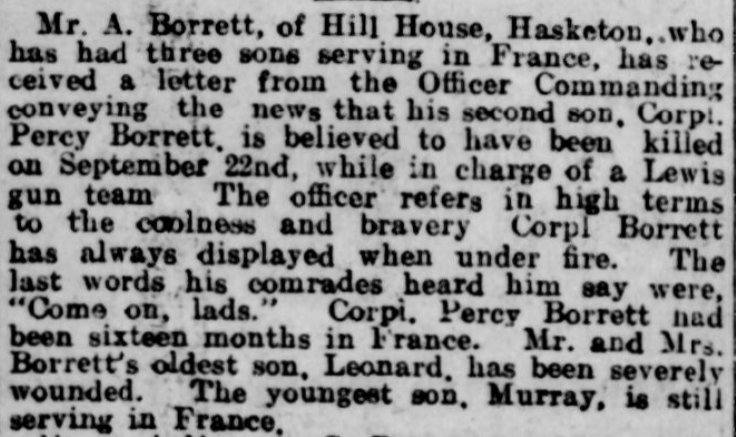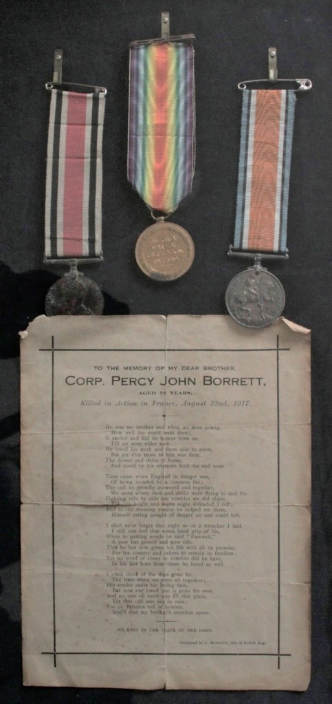 Percy was born in Hasketon early 1895, son of Arthur and Annie Borrett, and lived in Hill House, Mill Lane, Hasketon.