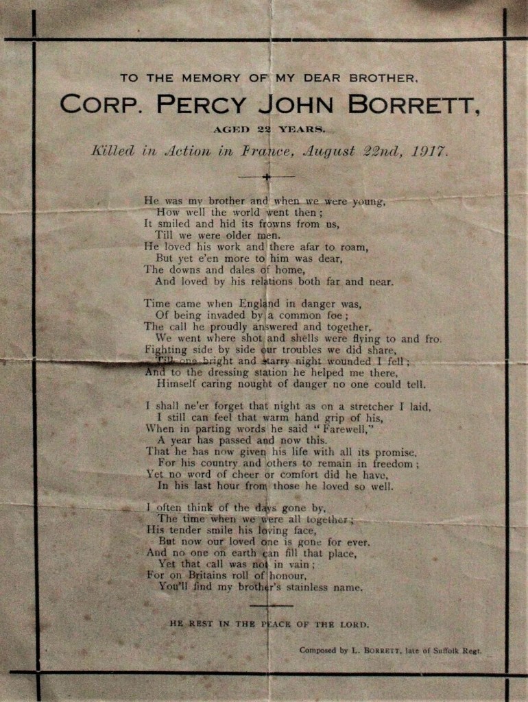 Percy’s brothers Murray and Leonard also enlisted: Murray in the Royal Garrison Artillery, and his service record has survived. He carried on in his father’s profession as a Market Gardener and can be found residing at Hill House in the 1939 register. Leonard also joined the Suffolk 4th battalion and was later wounded. He was able to say goodbye to Percy prior to going to hospital. They did not met again before Percy was killed, but he later wrote a moving poem to Percy which is shown below.
