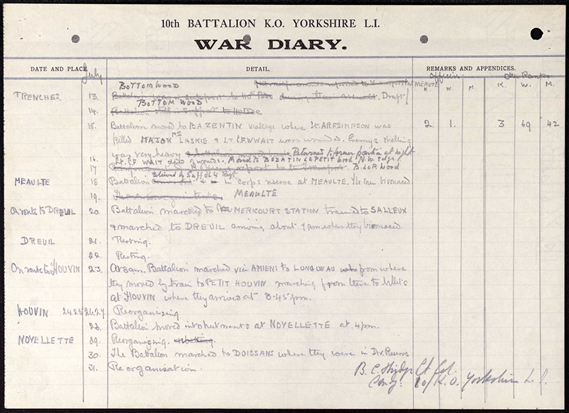 KOYLI 10th Battalion diary extract.