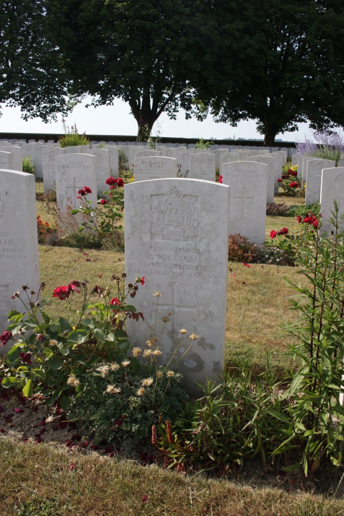 He died from a bullet wound sustained whilst carrying rations up to the trenches near Vieille Chapelle. John was initially buried in a military cemetary nearby, but after war, along with many other soldiers, he was re-interred in Cabaret-Rouge British Cemetery, about 13 miles away near Souchez.