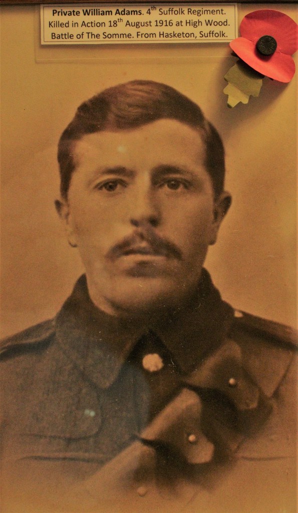 William was born in Grundisburgh, 1891, son of Henry and Emma Adams, and lived at Shoulder of Mutton Cottage, Hasketon.