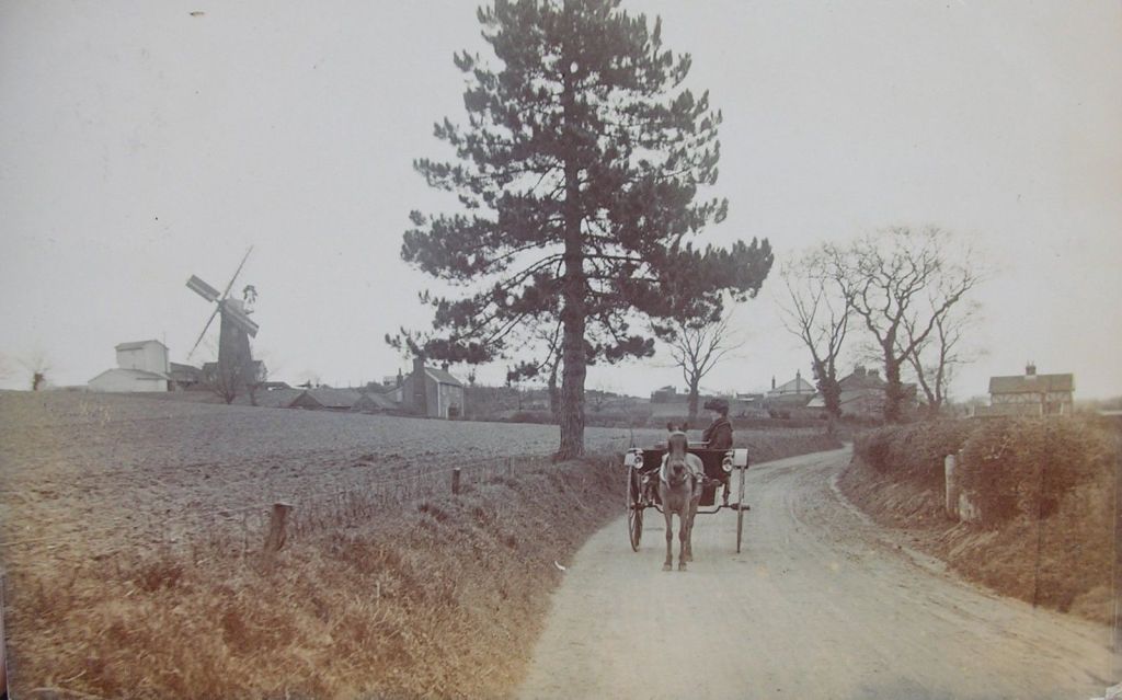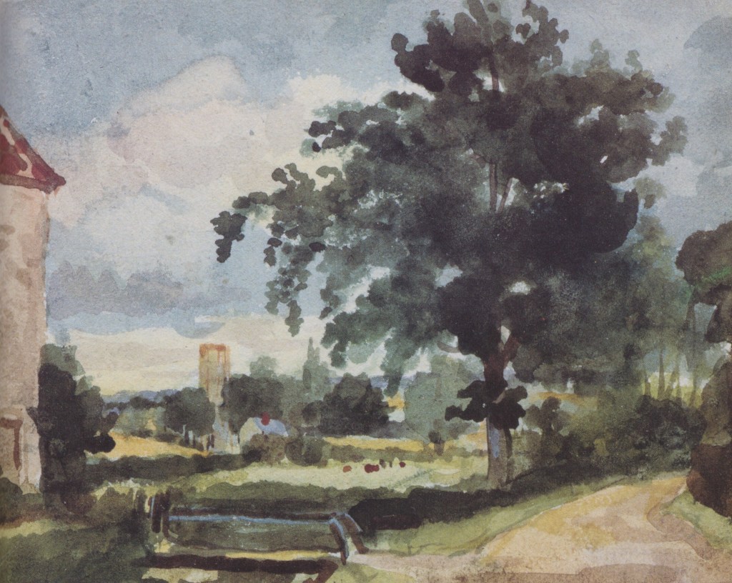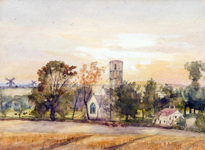 Probably painted at the top of hill in Blacksmiths Road, with the corner of the house currently called ‘Cherry Trees’ just visible on the left. Note the surface of the road is now a little lower and the school house has not yet been built.
