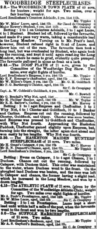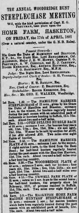 PROPOSED STEEPLECHASE MEETING WOODBBIDGE. On Thursday evening, a meeting was held at the Bull Hotel, Woodbridge, for purpose of arranging a Steeplechase meeting at Woodbridge on Easter Monday. Capt. R. J. Carthew presided, and there were also present: Capt. A. W. Cobbold, Dr. H. I. Kirkpatrick, Dr. G. Edwardes-Ker, Dr. J. W Green, Mr E. Branford, Mr. A. Pratt, Mr. W. M. Page, Mr. J. Smith, Mr. G. Booth, Mr. A. S. Gross, Mr. W. Brooke, Mr. A. S. Gayford, and Mr. J. H. Wrinch. After considerable discussion, it was resolved that a meeting be held, and that it be called “The first annual Woodbridge Steeplechase Meeting.” A first-class course bad been arranged, starting and ending in Bredfield Park, and those present formed themselves into a Committee for carrying out the project. Letters were read, approving the idea, from gentlemen, including Col. Barlow, Mr. Roger Kerrison, and others, and there seems every prospect of successful inauguration. Mr. G. E. Walker was appointed secretary, and it was decided to open a subscription list.