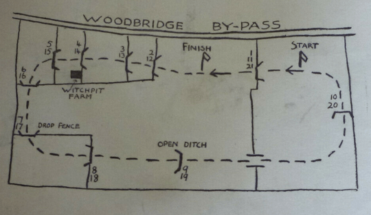 The generally agreed location for the racecourse is the fields to the west of the current A12, between Witchpit farm to the north and extending south into the fields behind Hasketon Manor. This is confrmed by the sketch map of the course from a racing programme in April 1950.