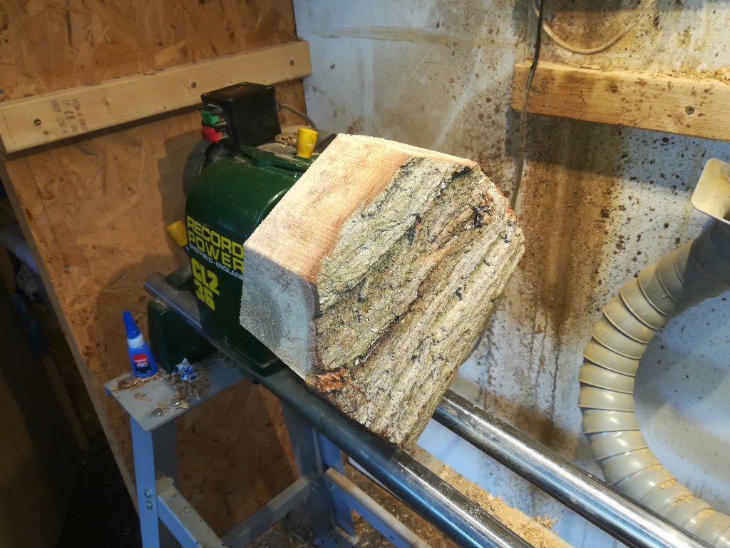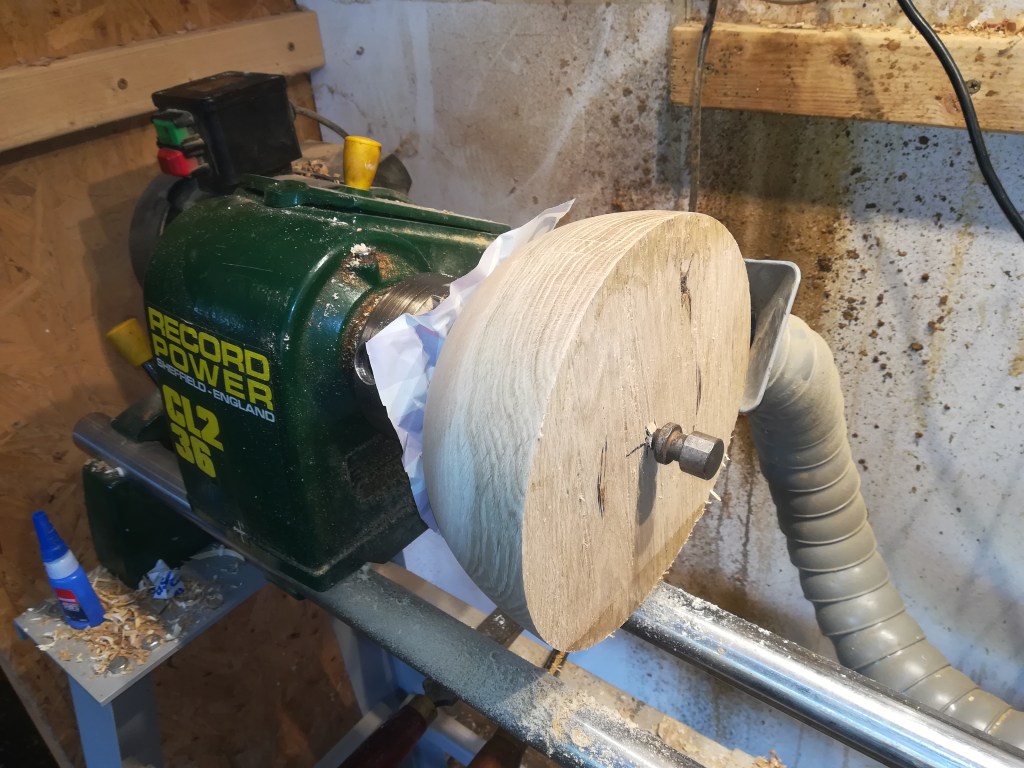 It’s somewhat wider than its thickness, so the first step is to cut it into a roughly circular shape and then mount it in the lathe using a screw-chuck. In this case I simply squared it off and removed the corners so it was octagonal, though a neater way is to cut it into a circle using a bandsaw.