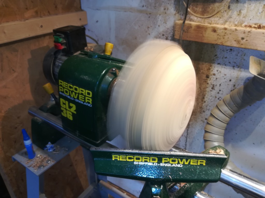 Its very unbalanced at this stage, so starting at a low speed (450rpm) I use a gouge to start the initial shaping. As it becomes rounder the balance improves and I can move up to my standard speed of 1000rpm.
